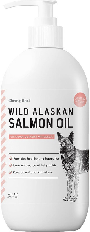 The Chew + Heal Pure Wild Alaskan Omega Salmon Oil Skin & Coat Liquid Supplement for Dogs is a su-paw tasty way to help keep your furbaby looking and feeling paw-some! It’s packed with vitamins, minerals, fatty acids and antioxidants to support a luxurious coat and healthy skin. It also works to help prevent bald spots, reduce excess shedding and moisturize dry, brittle hair. Unlike other salmon oils that feature blends of farmed salmon, this oil only uses wild-caught Alaskan salmon.