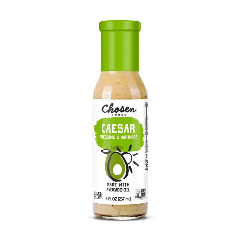 Chosen Foods Caesar Dressing is savory, creamy, garlicky and tangy. With lemon juice, garlic, mustard, black pepper, vinegar, and a dash of sea salt, this classic blend is tied together in a beautiful base of pure avocado oil. For salads, dips and marinades: Enjoy a healthier version of one of the world’s most loved salad recipes! Toss with organic mixed greens and kale, stir it into homemade dips and sauces, or marinate chicken, seafood and tofu. Healthy, gluten-free, dairy-free, vegetarian, certified by the Non-GMO Project, and free of canola and other oils. As always, our dressings contain no added sugar.