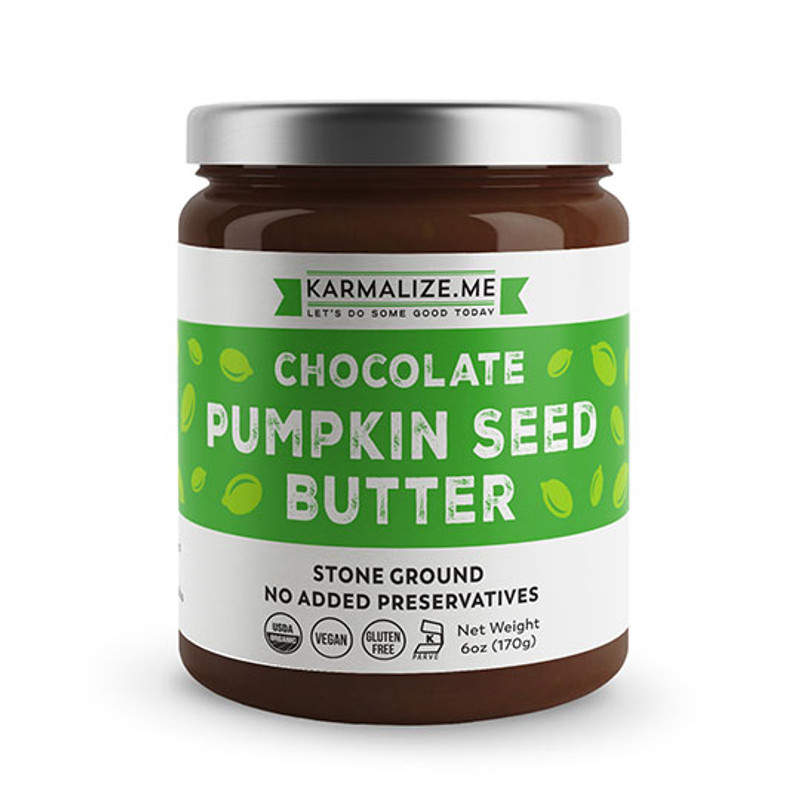 Organic Cacao Pumpkin Seed Butter has 10 gram proteins per serving! This mouthwateringly delicious Organic Cacao Pumpkin Seed Butter blends freshly roasted and stone ground organic pumpkin seeds, organic coconut palm sugar, organic cacao powder, organic virgin coconut oil, and sea salt to create a protein rich spread with a finger licking decadent dark chocolate flavor. Substitute Nutella with this healthful Organic Cacao Pumpkin Seed Butter in all your favorite recipes.