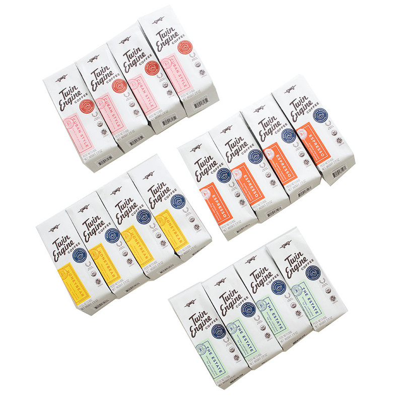 Introducing The Traveler! A beautiful selection of 20 ready-to-go bags of Twin Engine Coffee's best selling specialty coffees. Open & Brew. Each makes 6-8 cups of delicious coffee. Four coffee lines with 4 units each included in each pack. The Estate, Espresso, Honey Bear Reserve, and Cuban Style. Also perfect for gifting & tastings. All Ground.